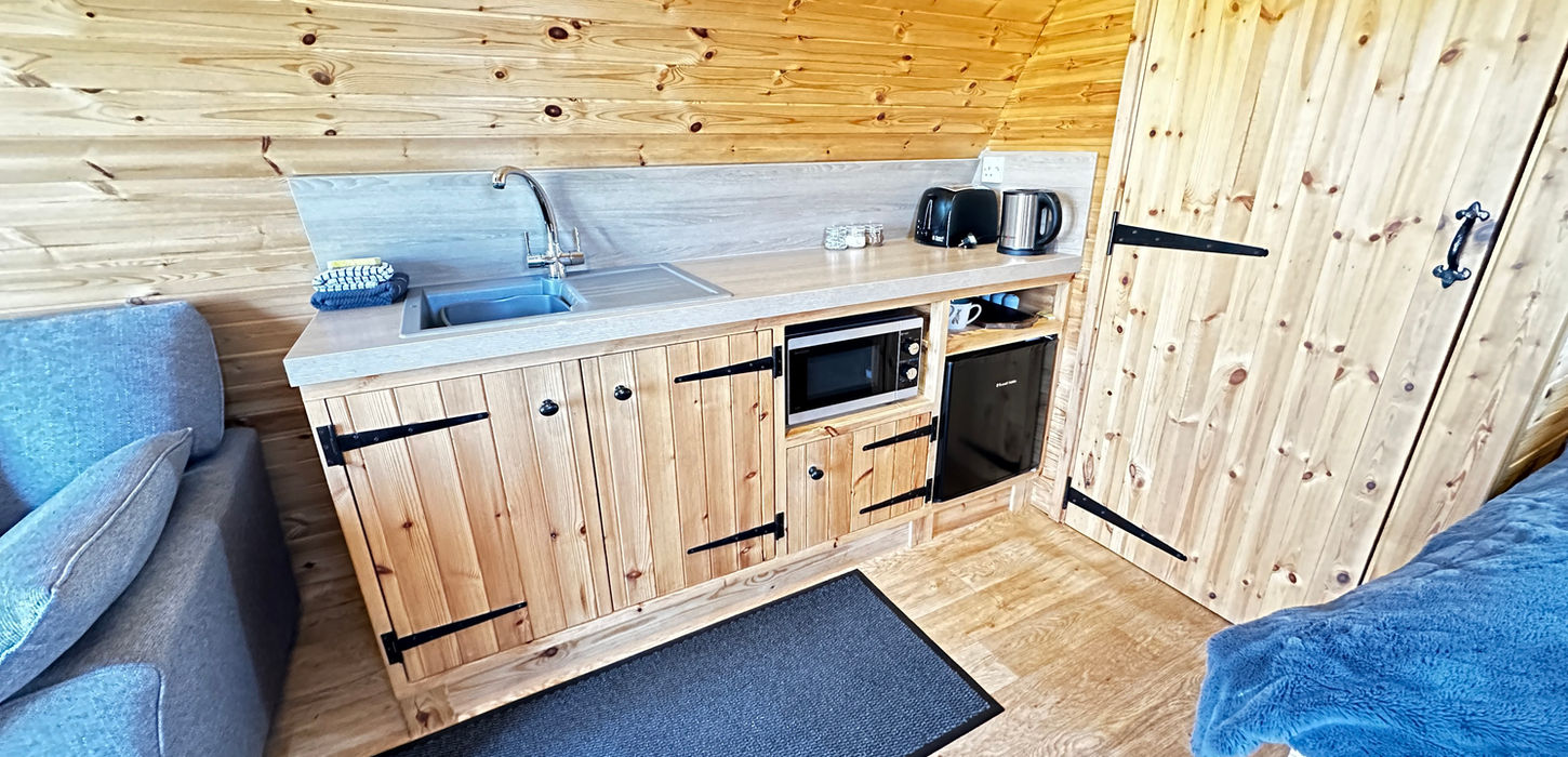 Pod One was the first to be built and remains a favourite with returning guests. It features a comfortable double bed and a relaxed, welcoming layout, and is closest to the parking and dog field.